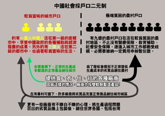 中國毒奶粉事件在這幾日可說是越演越烈。本來在這之前,中國黑心商品出現問題的新聞就時有所聞,而且也可以知道的是,毒奶粉事件也決對不會是最後一件。那為什麼中國有毒黑心商品會如果大規模的層出不窮,這當然不僅僅是因為商人的利益熏心,更有其根本的制度性原因,造成中國黑心商品的層出不窮。再加上中國的吏治腐敗與官商勾結導致的食品安全監督機制形同虛設,更是讓整個問題雪上加霜。中國黑心商品的產生可以說是有其制度上的「中國特色」。